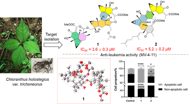 该论文运用UPLC-PDA-MS导向分离策略,从我国金粟兰属稀有种毛脉金粟兰中发现了两种乌药烷型倍半萜(LDS)三聚体新骨架化合物,分别命名为holotrichone A(1)与B(2)。化合物1为一分子LDS二聚体的惕格酸(2-甲基-2-丁烯酸)侧链与另一分子LDS单体发生homo-Diels-Alder反应形成一个具有全新3/5/6/6四环骨架的乌药烷三聚体。化合物2则是首个由一分子具有独特螺环结构的LDS二聚体与一分子p-苯醌-杂萜化合物通过hetero-Diels-Alder加成反应形成的杂三聚体,具有罕见的3/5/6/6/3/5/6/6/6多环稠合体系。它们的结构(包括绝对构型)通过光谱数据分析、NMR计算辅以DP4+分析、ECD计算以及单晶X射线衍射分析确定。化合物1和2能显著抑制急性髓性白血病MV-4-11细胞的增殖并诱导其凋亡。此研究成果为设计开发新型抗AML药物以及稀有金粟兰属植物资源的合理保护和可持续利用提供了新的科学线索。