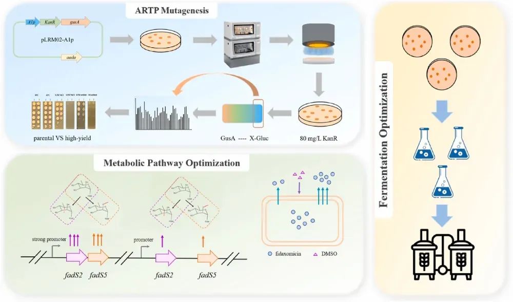 在文章2中,非达霉素是一种大环内酯类抗生素,广泛用于治疗艰难梭菌感染(CDI)。它显示出比万古霉素和甲硝唑显著更高的临床疗效。然而,由于发酵产量低,其大规模工业生产仍然是一个重大挑战。在本研究中(图2),研究人员选择了OE-R1/WT菌株作为起始菌株,其中特定途径的正调控因子fadR1被过表达。通过使用kanR/gusA双报告系统和ARTP突变技术,研究人员筛选出了一株高产菌株PA-13,其产量为757.34 mg/L的非达霉素,相比于OE-R1/WT提高了5.5倍,并且具有增强的遗传稳定性。此外,通过在生物合成簇中过表达两种甲基转移酶并补充外源性DMSO,作者进一步将非达霉素的产量提高至929.17 mg/L,同时将主要副产物的积累降低到20.9%。最终,通过在摇瓶和15升发酵罐阶段优化发酵策略,作者在15升发酵罐中实现了3949.05 mg/L的最终产量,这也是迄今为止的最高产量。该研究首次成功将Actinoplanes deccanensis中的非达霉素生产提升至超过3.9 g/L,为工业规模的发酵奠定了坚实的基础。此外,这为其他放线菌高产菌株的开发提供了重要的见解。