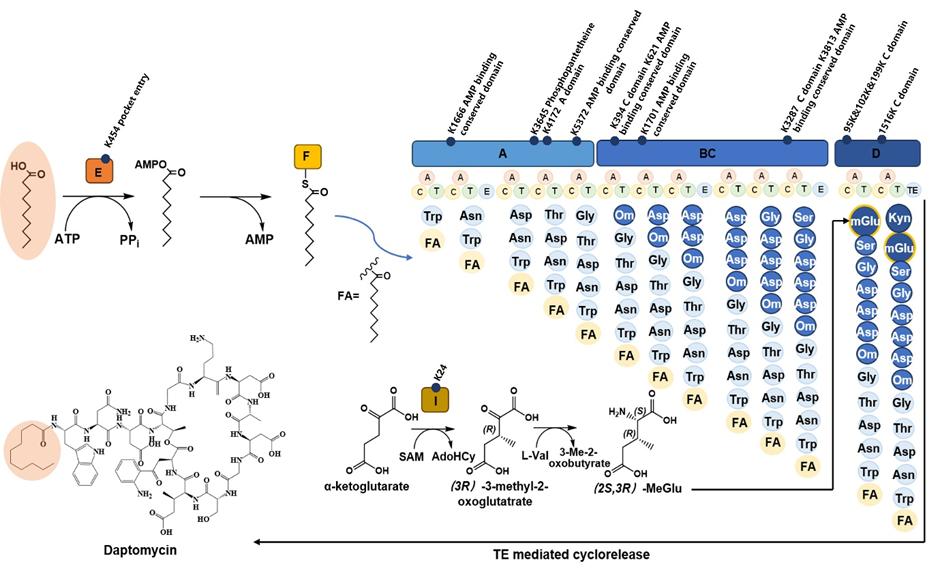在文章1中,达托霉素是广泛用于临床的环脂肽抗生素,是治疗某些多重耐药菌感染的最后手段(如耐万古霉素的肠球菌)。玫瑰孢链霉菌是达托霉素的生产菌株,脂肪酰-AMP连接酶DptE催化癸酸酰化从而启动达托霉素的生物合成(如图1)。达托霉素的生物活性与癸酰基密切相关。该文研究了次级代谢产物合成通路中关键酶的修饰对酶催化活性的影响,从而影响产物的产量。这是大多数研究者容易忽略的问题。正如文章所述,次级代谢产物对于微生物来讲是一把双刃剑,一方面合成这些次级代谢产物可以抵御严酷的外界环境,但是另一方面也加重了菌株自身的负担。转录水平和蛋白质水平的调控形成了一个类似于水龙头似的开关,可以启动某些次级代谢产物的合成,从而按需生产化合物。本文的研究可以给代谢工程、微生物天然产物生物合成的研究人员一定的启发,从蛋白质的修饰出发探索代谢产物合成的潜力。