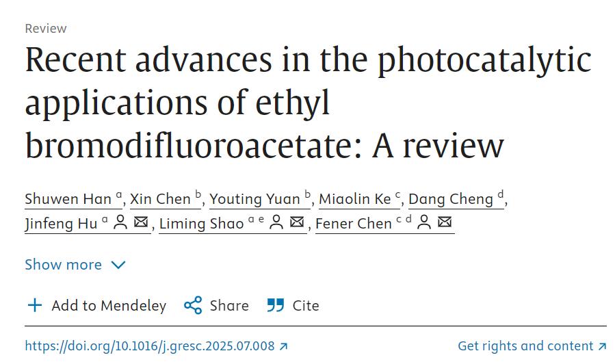 近日,我校药学院韩书文博士在中科院一区top期刊《Green Synthesis and Catalysis》上发表了题为“Recent advances in the photocatalytic applications of ethyl bromodifluoroacetate: A review ”的综述论文。台州学院为第一完成单位,台州学院药学院近年引进的青年教师韩书文博士为该论文的第一作者,复旦大学化学系陈芬儿院士、复旦大学药学院邵黎明教授(我校高等研究院/药学院柔性PI)和台州学院胡金锋教授为共同通讯作者。