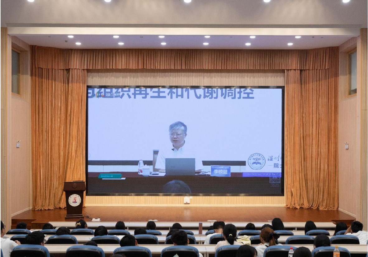 李校堃结合当今社会发展对科研工作者的要求,围绕如何传承科学家精神、怎样成为一名合格的健康中国追梦人进行阐述。他从“追求真理、百折不挠”的探索精神、“勇攀高峰、敢为人先”的创新精神、“开放包容、互利共赢”的合作精神,到“胸怀祖国、服务人民”的家国精神这四个方面深入讲解,与现场师生分享了自己及其团队多年来在“生长因子”研究过程中的所思、所悟、所感。他结合自己在求学和工作中的成长经历,倡导教师用正确的科学家精神引领学生,勉励青年学子要常怀感恩之心,永葆家国情怀,为实现中华民族伟大复兴而努力奋斗。