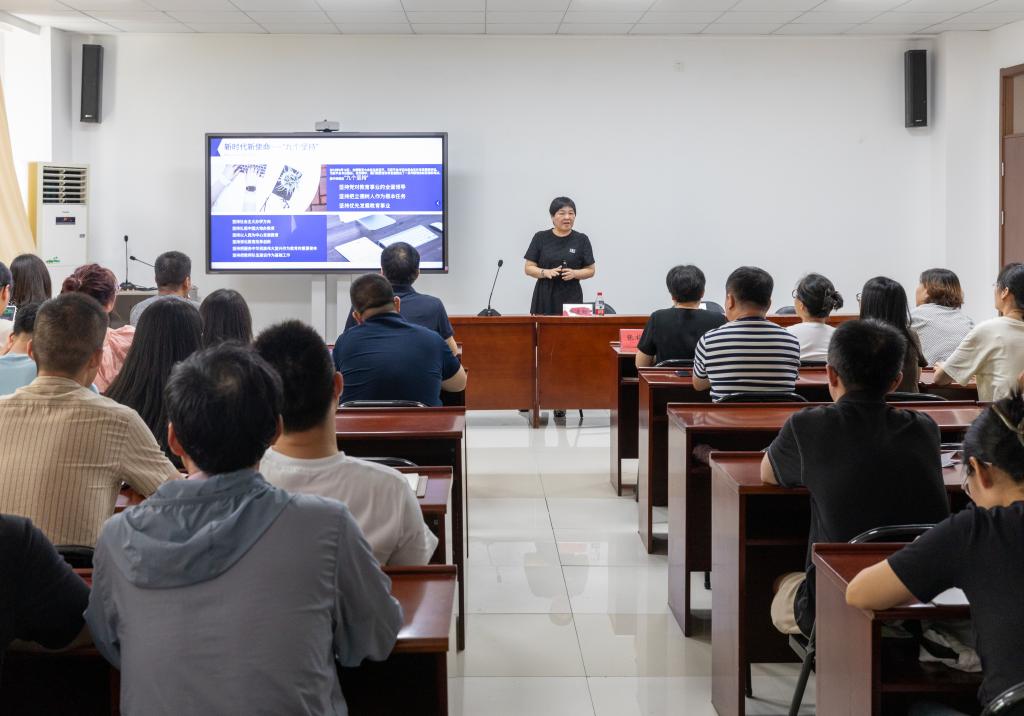 金凌虹报告主题为《教育强国高教何为?—新时代高等教育新使命新要求》。她从“新时代新使命”“高等教育新要求”“地方本科高校新作为”“新一轮审核评估要义解读”四个方面,对本轮本科教育教学审核评估的时代背景、意义、要求等做了全面剖析和解读,为全体教工迎评冲刺阶段工作做了全面引领。
