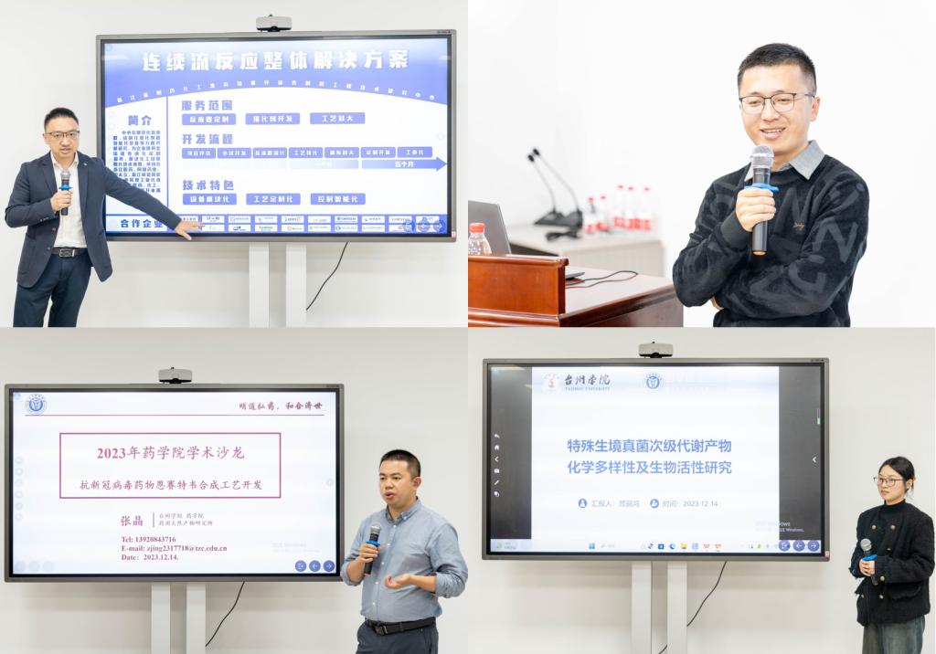 李嵘嵘、杜存彬、张晶、颜郦鸿4位博士分别就“连续流反应整体解决方案”、“分子动力学模拟在药物化学中的运用”、“抗新冠病毒药物恩赛特韦的合成工艺开发”和“松杉类珍稀濒危植物内生真菌次级代谢产物化学多样性研究”做了学术成果的分享。4位博士的学术报告内容丰富、观点独特,涵盖了药物化学、分子动力学模拟、药物合成工艺开发和植物内生真菌次级代谢产物化学多样性等多个研究领域,充分展示了药学院在药物研究和药物开发等领域的研究实力。参与此次学术沙龙的教师进行了积极的互动交流,为今后的合作研究奠定了基础。