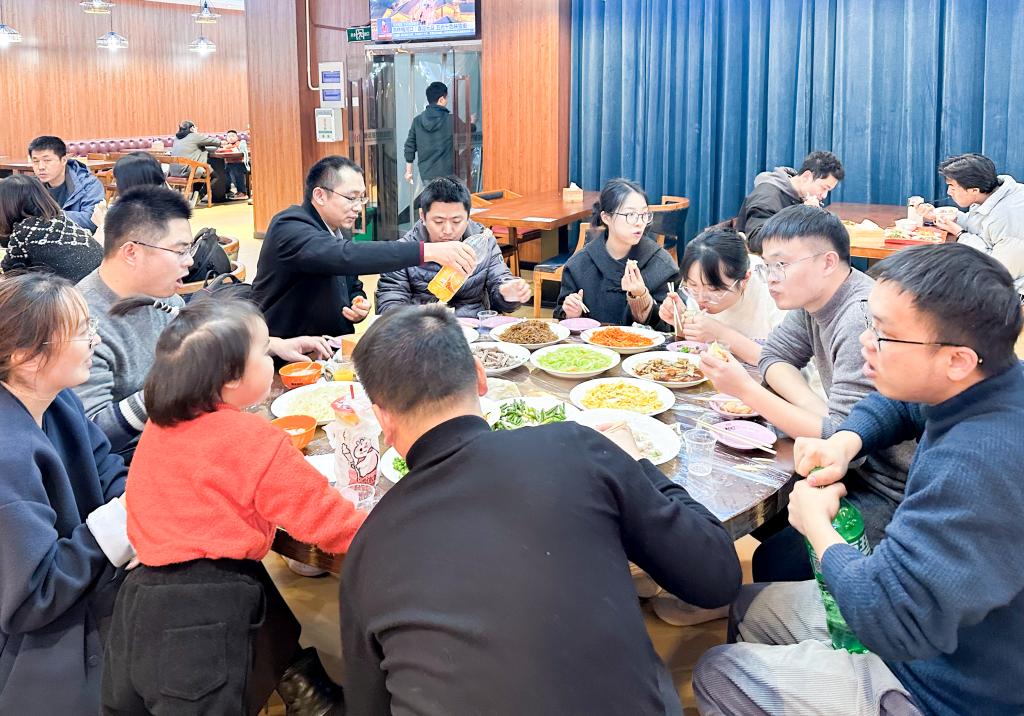 看似简单的包食饼筒,却需要一定的技巧。药学院教师年轻博士居多,来自五湖四海,对怎么包食饼筒并不十分熟稔。尚有经验者率先动手示范,首次尝试者跟着跃跃欲试,手法或许有点拙笨,塞进嘴里的却无疑是最好的味道。大家围坐一桌,欢声笑语、其乐融融,相互评价着谁包的像模像样,又津津乐道起自己家乡的美食。
