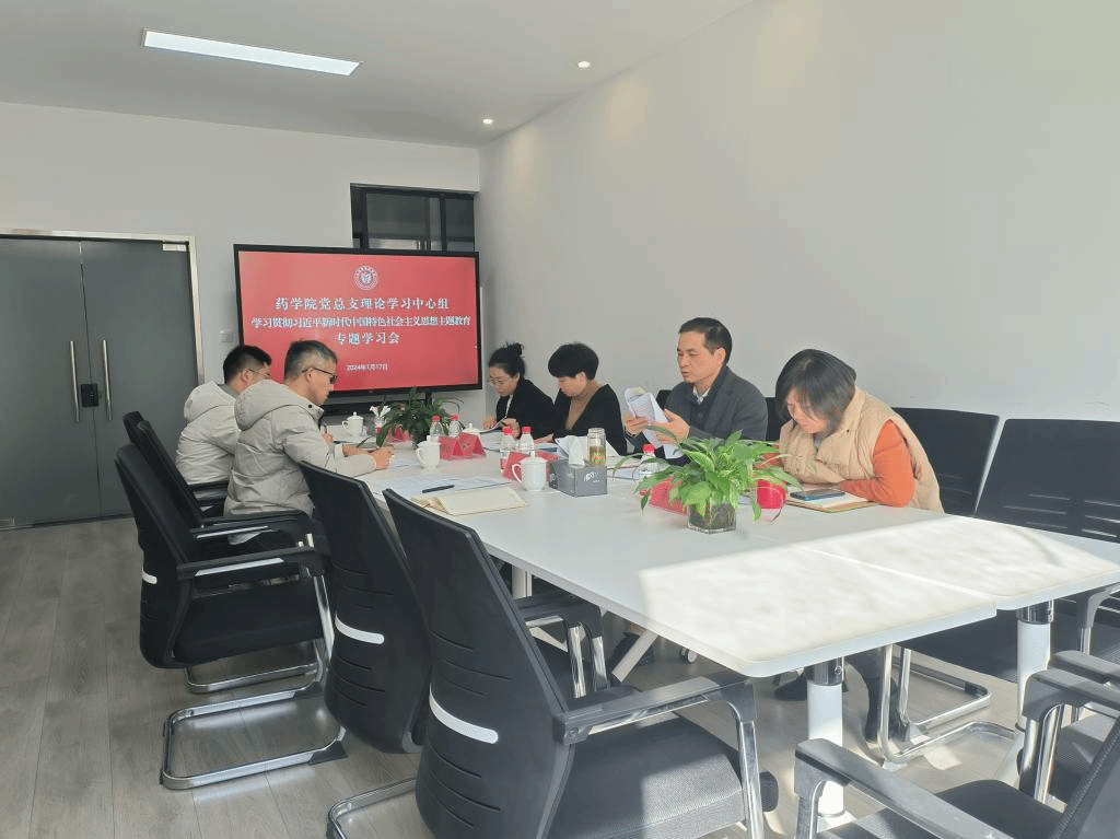 1月17日下午,药学院党总支理论学习中心组在B-248会议室,举行学习贯彻习近平新时代中国特色社会主义思想主题教育专题学习会,学院党总支书记张梅芬主持会议并讲话,学院党政班子成员参加。