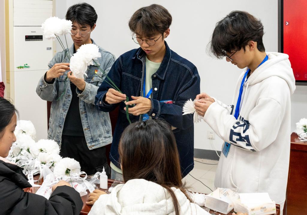 活动现场,学生们热情高涨,认真细致,纷纷投入身心于“扎花朵”中,力求将每一朵花都做得无可挑剔。他们用手中的白纸、细线、剪刀等材料工具,精心制作出一朵朵洁白无瑕的菊花,一张张纸在同学们的手里变成一朵朵为先辈送上的花,在亲身制作中感受先烈的抛头颅洒热血的坚毅和无私,也在学生心中播下了红色基因的种子。