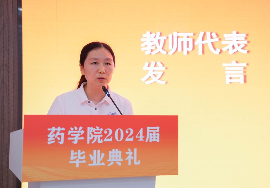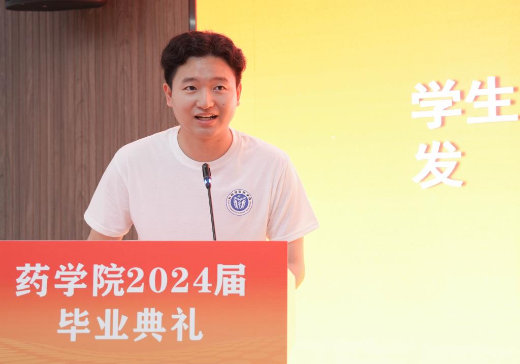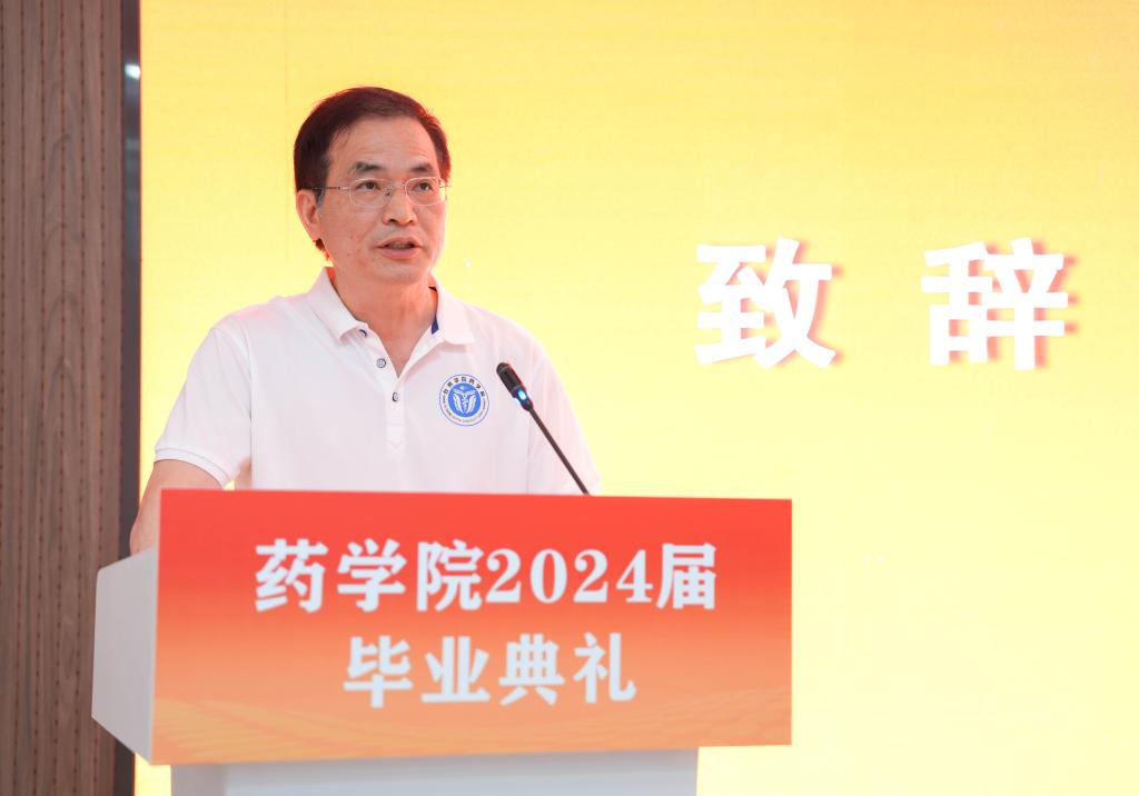 胡金锋在讲话中代表药学院全体师生,向顺利完成学业的各位同学表示热烈的祝贺,向悉心栽培的老师们表示衷心感谢,向一直支持和陪伴的家人朋友们致以崇高的敬意。