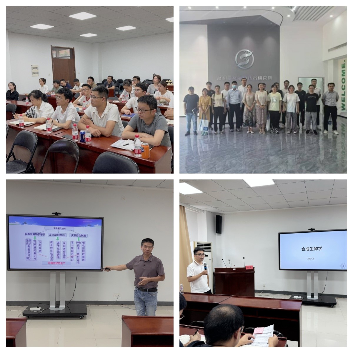 培训现场(左上)、参观启臻合成生物技术研究院(右上)、杨仲毅(左下)和周敏(右下)作专题报告