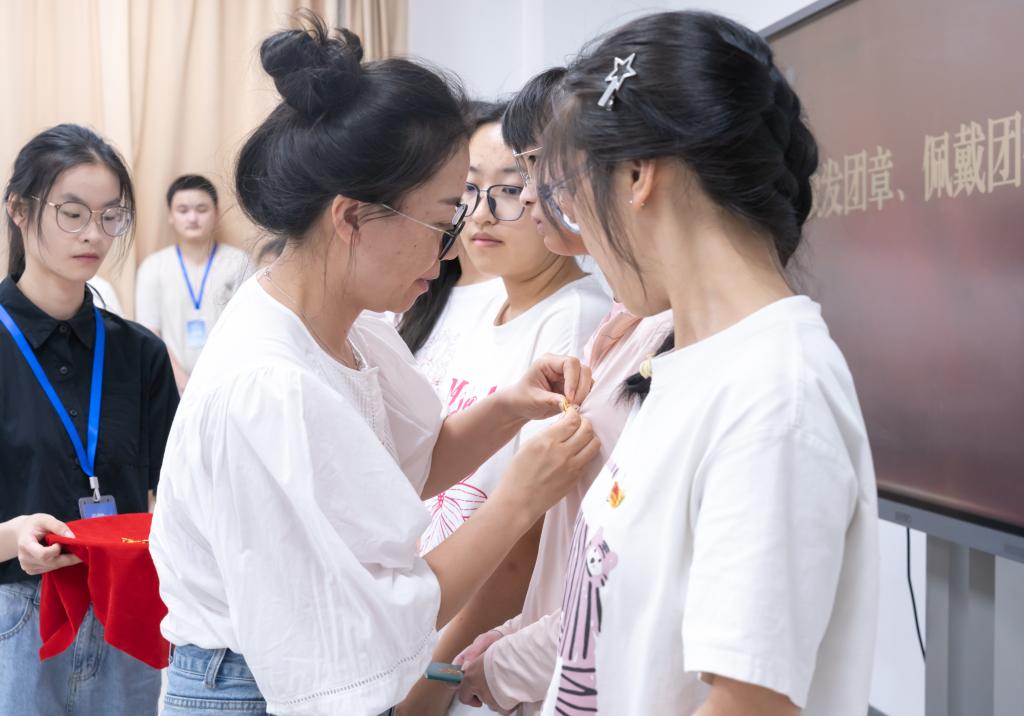 大会在激昂的团歌声中拉开帷幕。姚卓琳宣读新团员名单,并对学院15名新团员表示祝贺。随后,高阳为新团员颁发团章、佩戴团徽,一枚枚团徽闪耀,承载着责任与使命。新团员代表24药学班李勇、老团员代表23生物制药班邱佳豪分别发言,表达了将继续坚定信念、奋勇前行的决心。全体新团员在庄严宣誓中,许下为共产主义事业奋斗的铮铮誓言。