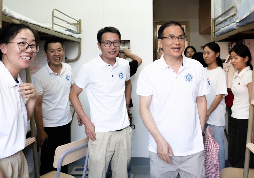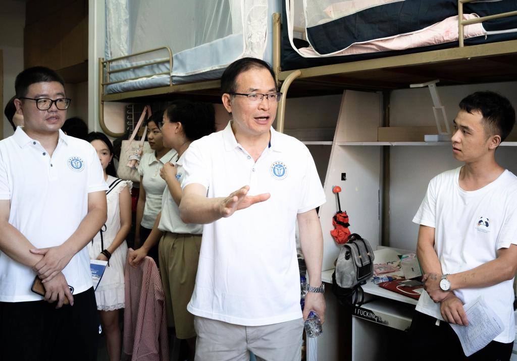 当天下午,胡金锋一行前往新生寝室,看望慰问刚刚入住的新同学。在寝室里,胡金锋一行与新生们亲切交流,详细询问他们的生活情况和适应状况,叮嘱大家要注意宿舍安全,保持良好的生活习惯,鼓励同学们相互关心、相互帮助,尽快融入新的集体生活。老师们的关心和问候让新生们深受感动,纷纷表示一定会努力适应大学生活,不辜负学院领导和老师们的期望。