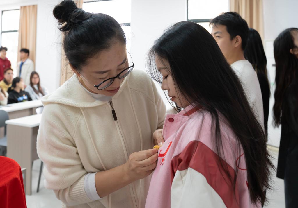 激昂的团歌声中,仪式正式启幕。彭珍珠宣读新团员名单,宣告优秀青年学子光荣入团。高阳为新团员佩戴团徽、颁发团员证,熠熠团徽成为新团员青春路上的崭新标识。新团员代表25生物制药班李好分享入团的喜悦与责任,承诺以团员标准严格自勉;老团员代表24药学班厉思奇结合自身经历分享成长心得。在24药学班李勇领誓下,全体新团员面向团旗庄严宣誓,铿锵誓言彰显药学青年的初心与使命。