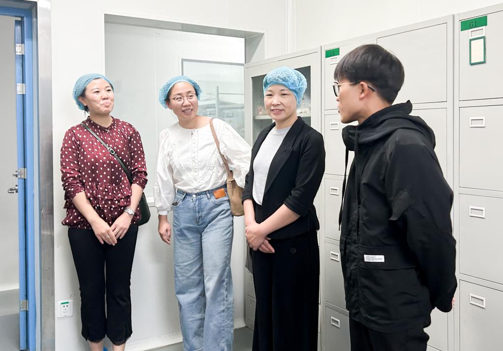 在新维士生物科技有限公司,张梅芬一行在该公司生产工程部、研发技术部副总经理凌海源、人力部经理陈晓的陪同下,参观了新维士展厅、“360全景云直播工厂”、车间,深入了解新维士的研发、生产、销售等情况;一行人还看望了工作在研发岗位上的毕业生,并与其亲切交流。