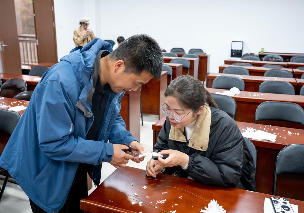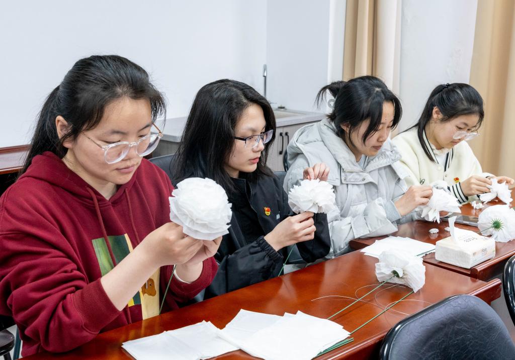 活动现场,学生们热情高涨,认真细致,纷纷投入身心于“扎花朵”中,力求将每一朵花都做得无可挑剔。他们用手中的白纸、细线、剪刀等材料工具,精心制作出一朵朵洁白无暇的菊花,一张张纸在同学们的手里变成一朵朵为先辈送上的花,在亲身制作中感受先烈的抛头颅洒热血的坚毅和无私,也在学生心中播下了红色基因的种子。