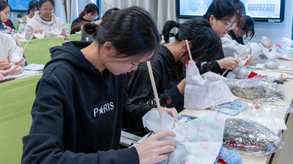 活动伊始,药学院团学会学生干部何婷为同学们讲解了制作“艾草锤”的过程,耐心引导同学们逐步完成艾草锤的制作。活动现场气氛热烈,同学们积极参与其中,充分展现出对此次活动的高度热情。在完成艾草锤制作后,同学们纷纷为考研学子写下暖心寄语,字里行间满是真诚的祝愿。