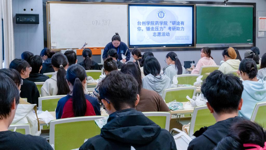 随着2024年全国硕士研究生招生考试日益临近,为帮助考研学子缓解备考压力,坚定考试信心,11月10日下午,药学院在椒江校区4-101教室举办“研途崎岖,锤走压力”考研助力活动。